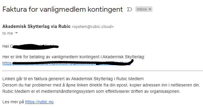 Medlemsavgiften for 2021 er nå sendt ut på e-post fra Rubic. Har du mottatt en mail som ser omtrent ut som den under, kan du trygt trykke på lenken. Rubic er det nye medlemssystemet vårt.