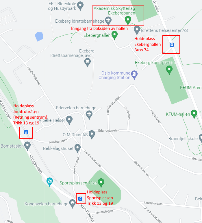 Ekeberghallen har parkeringsplasser, og offentlig transport i form av trikk (linje 13 eller 19 til Sportsplassen om du kommer fra sentrum, eller Jomfrubråten om du reiser mot sentrum) og buss (linje 74 til holdeplassen Ekeberghallen). Inngangen til pistolbanen er på langsiden av Ekeberghallen (den siden som ligger lavest i terrenget), rett ved minigolfbanen (altså ikke hovedinngangen). Banen er rett frem inn døren. Send e-post til styret dersom du er ved banen og ikke finner fram.